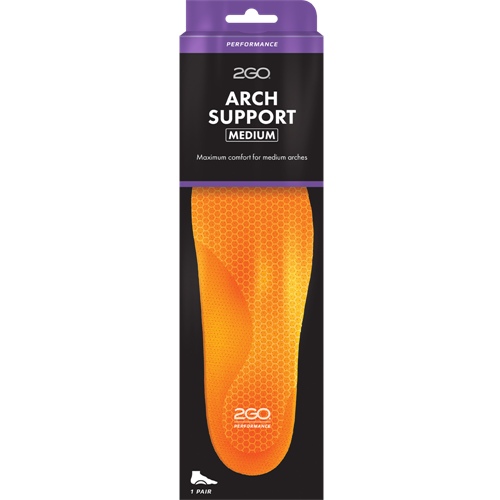 Komfort för normalhöga fotvalv. 2GO Arch support Medium är en sula med hög prestanda som ger nödvändigt stöd och komfort för dig med mediumhögt fotvalv. Minskar ansträngning och känslan av trötta fötter och vader. Den skålade hälen håller foten på plats. Fotbädden och dess dynamiska form ger långvarigt stöd för mediumhöga fotvalv. Häl- och förfotskudde som ger utmärkt stötdämpning, jämnar ut tryckbelastning och förbättrar prestationsförmåga. Speciellt utvecklad för sportskor, trainers och kängor.