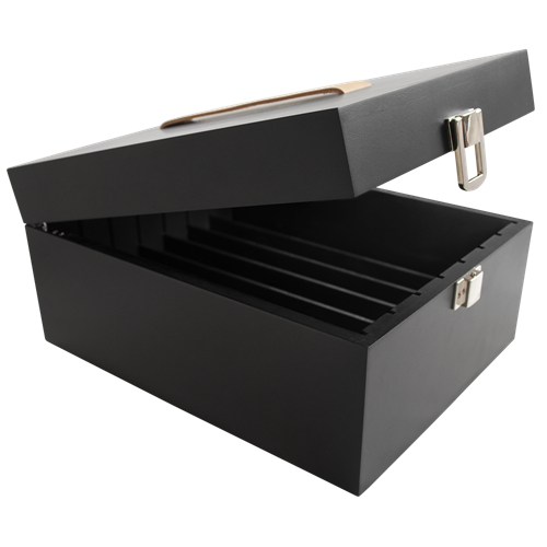 Skoputsarlåda i modern design med svart mattlackad finish. Metalbeslag och handtag i läder. Insidan kan arrangeras helt efter önskemål med justerbara avdelare.